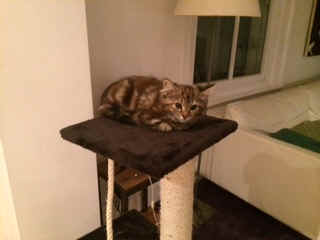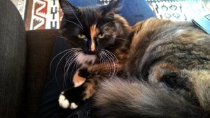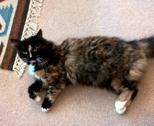 with faint stripes on her back and answers to Cosmic. She is